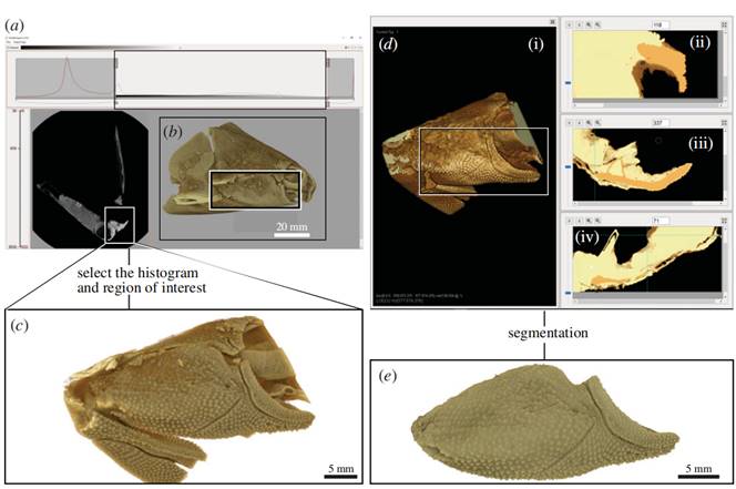 图2. 使用Drishti Paint对澳大利亚早泥盆世盾皮鱼颌骨脉管结构进行三维重建