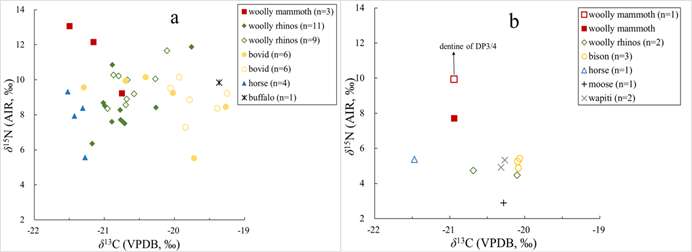 中国科学院古脊椎动物与古人类研究所的马姣、王元与复旦大学的胡耀武、德国图宾根大学的Hervé Bocherens等研究人员进行合作,综合利用多种生物地球化学的研究手段,对黑龙江省阎家岗遗址及俄罗斯远东地区的地理学会洞穴(Geographical Society Cave)的猛犸象-披毛犀动物群进行系统的古生态研究。碳氮稳定同位素分析揭示出两个遗址点的真猛犸象均以禾草类及苔草类(grasses/sedges)为主要食物来源,而披毛犀和野牛等动物的食物来源相较于真猛犸象更为灵活多样。基于质谱的动物考古学分析(Zooarchaeology by Mass SpectrometryZooMS)不仅提供了精确的动物种属鉴定结果,并且准确鉴定出一例阎家岗的王氏水牛样品。多个样品的碳十四测年结果为43,447/>41,964-38,204 14C BP,比阎家岗遗址在上世纪八十年代发表的测年结果明显偏早。本研究近期在线发表于国际专业杂志《国际第四纪》(Quaternary International)。