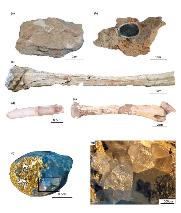 围岩包裹着骨骼化石,中空骨骼内部为浅色填充物(a)和深色填充物(b);开裂剥落的骨骼化石(c, d, e);中空骨骼化石内偶见结晶良好的无色透明晶体(f, g)