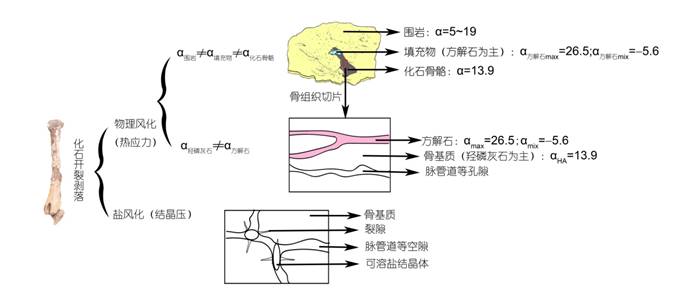 其次,由于化石各组分之间热膨胀系数不同,在巨大温差作用下,化石内部产生巨大热应力导致开裂。应力的来源有两方面:一是在骨骼的脉管道等孔隙中存在一定量的方解石,其热膨胀系数存在各向异性,随着温度不断变化,骨骼内的方解石与羟磷灰石膨胀收缩的体积不同,造成应力的局部集中,产生微裂隙,从而对化石结构造成破坏;二是由于外部围岩、骨骼化石和内部填充物三者之间的热膨胀系数不同,在温度变化下,以方解石为主的内部填充物、骨骼化石和外部砂岩的热膨胀系数不同导致化石产生热应力,在昼夜温度的循环变化下,围岩—骨骼化石界面和骨骼化石—填充物界面会不断产生应力,在长期的应力作用下会使得化石开裂剥落。