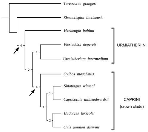 此外,研究人员还对和政羊的系统发育关系进行探讨,并对中国晚中新世“麝牛类”牛科动物的系统发育关系进行了系统的梳理。这是一类头骨和角心都很特化的牛科动物,其系统发育关系极具争议。尤其是近年来,分子生物学的发展为现生牛科动物的演化关系带来了很多新的观点,特别是现生麝牛(Ovibos)不再与羚牛(Budorcas)构成姐妹群,而是与鬣羚(Capricornis)、斑羚(Naemorhedus)组成一个单系类群,位于羊族(Caprini)的基干位置,与传统的基于形态的分类学观点差别较大。在这样的背景之下,中国晚中新世“麝牛类”牛科动物的与现生麝牛的关系,以及它们在整个牛科动物演化关系中的位置都亟待讨论。在该研究中,研究人员选取了110个头骨、牙齿及角心的形态学性状,建立了包含7种化石牛科动物、13种现生牛科动物的形态学矩阵,使用分支系统学的方法进行分析。结果表明,晚中新世“麝牛类”与中中新世土耳其羚(Turcocerus)、现生羊族、狷羚族、马羚族都位于同一支系上,但是相比现生种类,它们都是该支系上较早的分支,是灭绝了的早期类型,与现生麝牛的类亲源关系较远。只有中华羚(Sinotragus)位于现生羊族、狷羚族和马羚族组成的冠群之中,是一种更加进步的牛科动物。