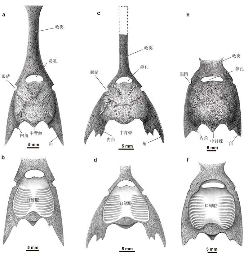 长吻三歧鱼在分类上属于无颌类盔甲鱼亚纲三歧鱼科,因其头甲形状如古代兵器三叉戟,前面吻突又极度延长而得名(吻突长度可达头甲中长的2.5),因此堪称泥盆纪海洋中游动的“三叉戟”。三歧鱼科在无颌类盔甲鱼中一直是一个神秘而独特的存在,其标志性的三叉戟形头甲和半月形鼻孔,很容易跟其他盔甲鱼类区分,目前仅含有1属3个种,分别是长吻三歧鱼、昭通三歧鱼和越南三歧鱼,堪称三歧鱼三兄弟。因此,三歧鱼科也是目前盔甲鱼类中唯一一个仅含有一个属的科级分类单元。长吻三歧鱼最初由盔甲鱼类研究第一人刘玉海先生1975年发现于四川江油龙门山雁门坝的泥盆纪地层,是世界上第一个具有完整身体保存的盔甲鱼类。同期刘玉海先生也报道发现于云南北部昭通地区同时期的昭通三歧鱼。云南昭通和四川江油在地理位置上离的很近,都属于华南板块北部,因此长期以来一直认为三歧鱼的生活区域可能仅局限于华南板块的北部。直到2002年赵文金等人在滇东南文山发现了长吻三歧鱼和2009年法国古生物学家菲利普.让维埃在越南北部发现了越南三歧鱼,人们才意识到三歧鱼分布范围比原来想象的要广泛,可能是盔甲鱼类中分布最为广泛的一个属种。但是在三歧鱼的南北地理分布上,存在上千公里的地理间隔,对于游泳能力较弱,营底栖生活的三歧鱼是怎样完成了长距离的迁徙,一直是困扰古生物学界的未解之谜。此次长吻三歧鱼在云南曲靖“古鱼王国”的首次发现,不仅扩大了三歧鱼在华南板块的分布范围,而且曲靖地区恰好处在江油地区和越南北部地区之间的位置上,填补了三歧鱼南北分布的地理空白,为研究三歧鱼的南北迁徙路线提供了重要资料,因此又具有独特的生物地理意义。