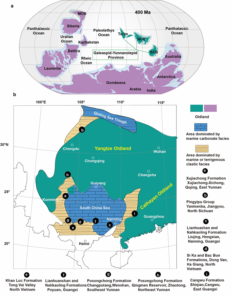 长吻三歧鱼在曲靖的发现也具有非常重要的古地理意义。三歧鱼分布的五个化石地点都属于华南板块,由扬子古陆和华夏古陆组成。早泥盆世期间,华南板块位于低纬度古赤道地区,并被古特提斯洋与古太平洋从劳亚古大陆和冈瓦纳大陆隔离开来。在扬子古陆和华夏古陆之间存在一个陆表海湾,即华南海(图4)。大约4.2亿年前(洛赫考夫期),中国南部发生海侵,海侵从西南向广西中部和西部延伸。大约4.1亿年前开始(布拉格期),在广西造山运动之后,华南海覆盖了华南板块南缘的大部分地区,这使得华南板块广泛发育了近岸含化石的硅质碎屑岩和石灰岩,比如广西六景的那高岭组、曲靖的徐家冲组、昭通的坡松冲组、文山的坡松冲组、江油的关山坡组、梧州的苍梧组、越南北部Khao Loc组和Si Ka组均为华南海附近的近岸至三角洲相沉积,为这时期的植物、鱼类和腕足类化石的保存提供了有利的沉积环境。在这一时间,古鱼类组合、早期维管植物组合和无脊椎腕足动物东京石燕(‘Spirifer’tonkinensis)组合面貌,表现出高度相似地方性色彩,跟世界其他地方的动物群面貌明显不同,比如尽管在澳大利亚、北美、欧洲和西伯利亚等地有大量早泥盆世鱼类化石发现,但跟我国华南板块的早泥盆世古鱼类面貌明显不同,特别是华南板块的无颌类盔甲鱼类和盾皮鱼类云南鱼类化石,呈现出很浓厚的土著性色彩。1981年,澳大利亚著名古鱼类学者加文· 杨(Gavin C. Young)首次将早泥盆世华南板块的古鱼类作为一个独立的动物区系,并命名为“盔甲鱼—云南鱼”动物区系。综合证据显示,今天的云贵高原和广西地区在4.1亿年前的早泥盆世是一片近于封闭的陆表海湾,即华南海,有一个间歇性向南的开口,形成了类似现代红海的那种封闭的环境。由于封闭海效应,形成了一个独立的生物演化区域,被称为生物多样性热点(biodiversity hotspot),生物在这个封闭的环境中独立演化,表现出很高的多样性和很强的土著性。