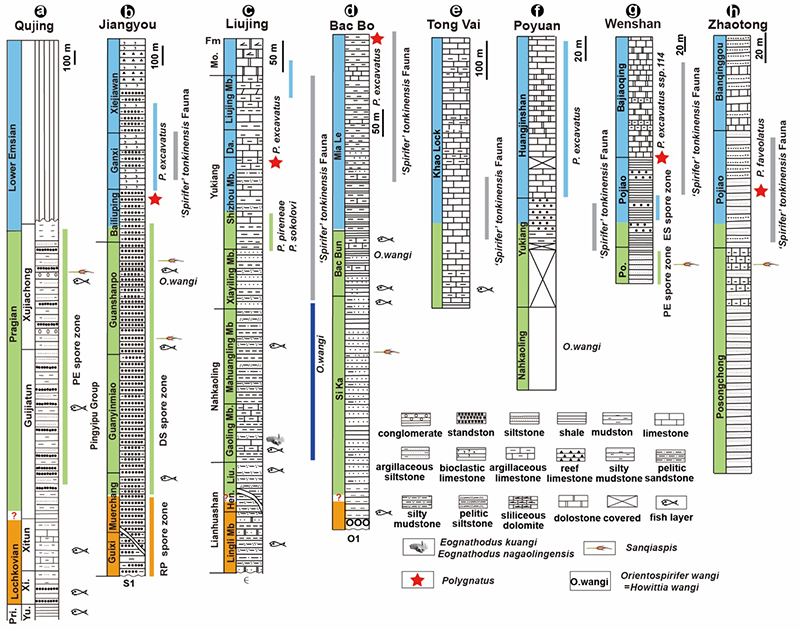 长吻三歧鱼在曲靖的发现也具有非常重要的生物地层意义。三歧鱼是盔甲鱼类中唯一一个同时出现在云南曲靖徐家冲组、云南文山、昭通的坡松冲组、四川江油关山坡组、越南Si Ka组和广西南宁那高岭组的盔甲鱼类,从而为它们之间的对比,提供了最直接的古鱼类学证据。特别是越南Si Ka组的越南三歧鱼,因其与廖角山多鳃鱼共生在一起,法国著名古生物学家菲利普.让维埃一直认为其出现的时代比中国的三歧鱼出现的时代要稍早一些,属于早泥盆世洛赫考夫期(约4.2亿年前)。但是,近年来的古生物化石证据显示,廖角山多鳃鱼的延续时代较长,可能从早泥盆世洛赫考夫期(约4.2亿年前)一直延续到早泥盆世布拉格期(约4.1亿年前)。三歧鱼是徐家冲组合的重要成员,通过对我国华南和越南北部早泥盆世的8个含鱼地层的综合对比表明,这些非海相三歧鱼所在的地层可以与广西六景段莲花山组和那高岭组之间的过渡层进行对比(图5),而那高岭底部含有时代明确的布拉格期牙形类标准化石。因此,越南北部的Si Ka组中上部和广西的莲花山组上部的年代应该是布拉格期,而不是洛赫考夫期。华南板块布拉格期的古鱼类化石组合详细记录了盔甲鱼类尤其是华南鱼目在早泥盆世的快速辐射演化。