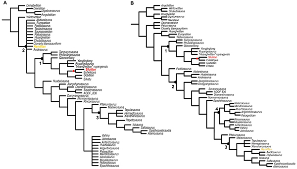 中国丝路巨龙和新疆哈密巨龙作为两个独立的分类单元:(A)等权重和(B)扩展隐含权重,k值为9。1. Euhelopodidae, 2. Titanosauria, 3. Lithostrotia, 4. Colossosauria