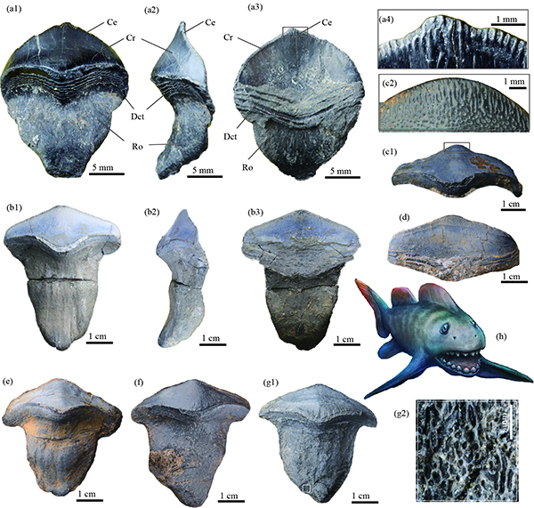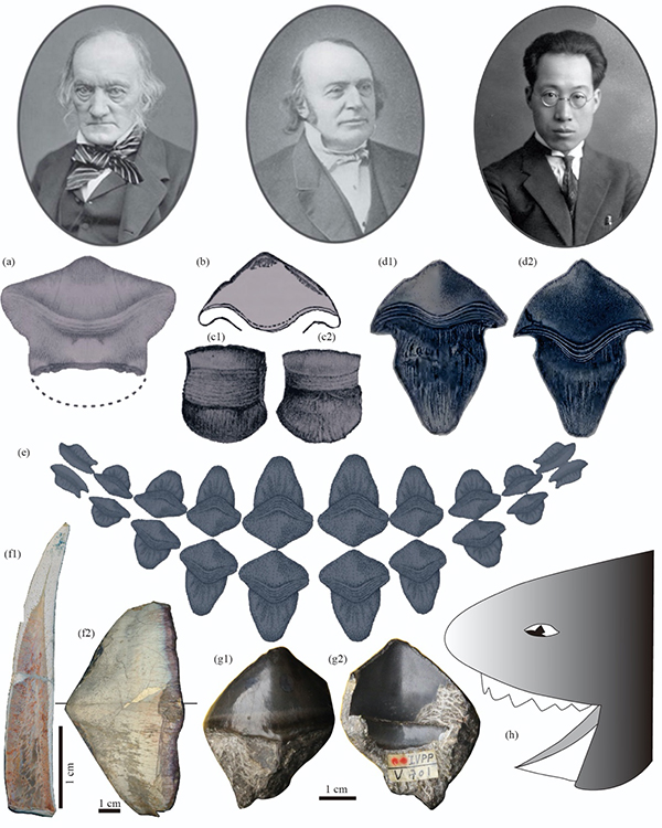 图2 早期研究对瓣齿鲨进行系统研究的三位先驱以及他们研究的标本:理查德·欧文爵士(Richard Owen,1804-1892),英国古生物学家、动物学家,现代古生物学的奠基人之一,“恐龙(Dinosaur)”的命名者(左); b, 路易斯·阿加西(Louis Agassiz,1807-1873)生于瑞士,是一名古生物学家、冰川学家、地质学家,也是地球自然历史研究领域的一名杰出革新者(中); C, 中国古生物学的奠基人、著名古生物学家杨钟健先生(右);a:瑞士著名古生物学家路易斯阿加西命名的‘Chomatodus acuminatus;b、d:俄亥俄瓣齿鲨;c1、c2:英国著名古生物学家欧文发现的Petalodus ‘hastingsii’;e:瓣齿鲨的齿列;f1、f2:1965年刘宪亭报道的“兴国瓣齿鱼相似种;g1、g2:1950年杨钟健报道的“兴国瓣齿鱼”;h. “兴国瓣齿鱼”的牙齿实际为巨栉瓣齿鲨(Megactenopetalus,Pristodontidae)的中下颌齿(林翔鸿提供,盖志琨摄)。