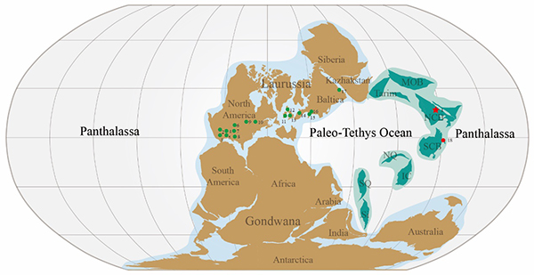 图4 瓣齿鲨属在二叠纪乌拉尔期的古地理分布图(林翔鸿提供)