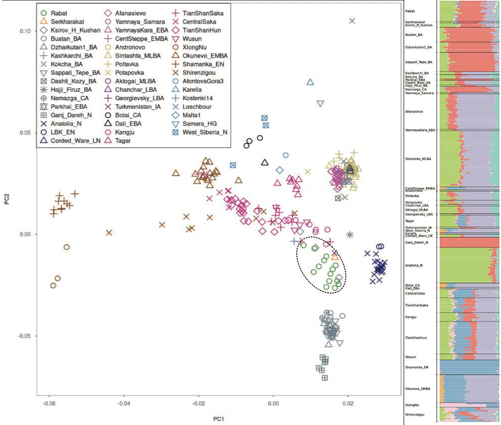 此前有研究表明,青铜时代巴克特里亚·马尔吉阿纳文明区(BMAC)人群的主要遗传成分由伊朗农业人群成分(~60-65%)、安纳托利亚农业人群成分(~20-25%)组成,部分人群还含有青铜时代欧亚草原牧民的遗传成分。该研究显示,拉巴特古人群除含有伊朗农业人群、安纳托利亚农业人群、欧亚草原牧民遗传成分外,还含有少量欧洲西部、东亚、南亚狩猎采集相关人群的遗传成分。