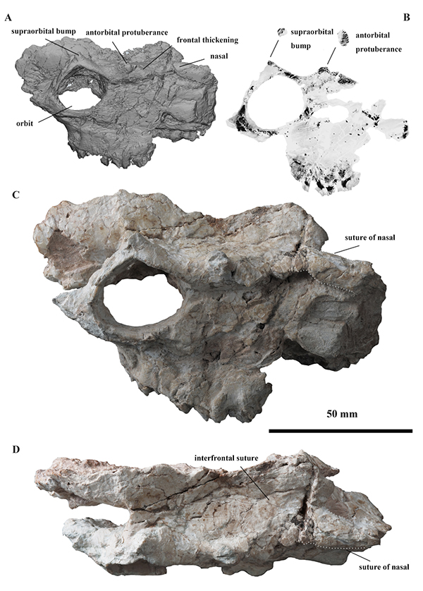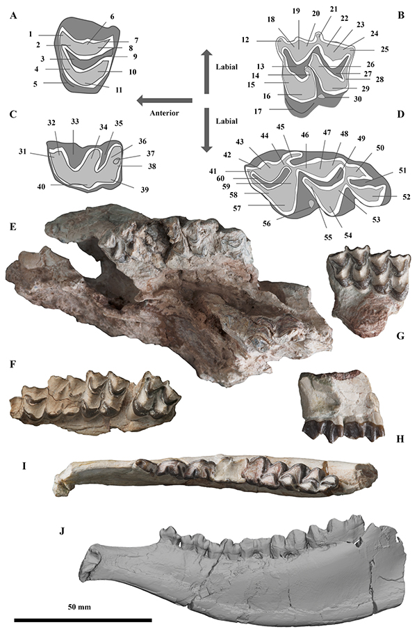 近日,一支以中国科学院古脊椎动物与古人类研究所邓涛研究员和李强研究员为通讯作者、南京大学李刈昆博士为第一作者的中外合作团队在国际期刊《林奈动物学报》(Zoological Journal of the Linnean Society)在线发表题为“The early evolution of cranial appendages in Bovoidea revealed by new species of Amphimoschus (Mammalia: Ruminantia) from China”的论文,报道了青藏高原北缘、甘肃省塔奔布鲁克盆地西水沟地点反刍动物化石的最新研究成果。这次报道的材料包括一件部分保存的头骨,一件较为完整的下颌和两件部分保存的上颌。研究人员依据颊齿的形态学特征,如具有发育的下外附尖/下内尖,下原尖后外嵴(古鹿褶)缺失,下m3第三叶呈现双新月形、具有发育的下内小尖等,将其归为半麝属Amphimoschus;而依据该属首次出现的头骨附属物,包括眶上隆起、眶前隆起和加厚的额骨等,将其建立为新种西水半麝Amphimoschus xishuiensis。