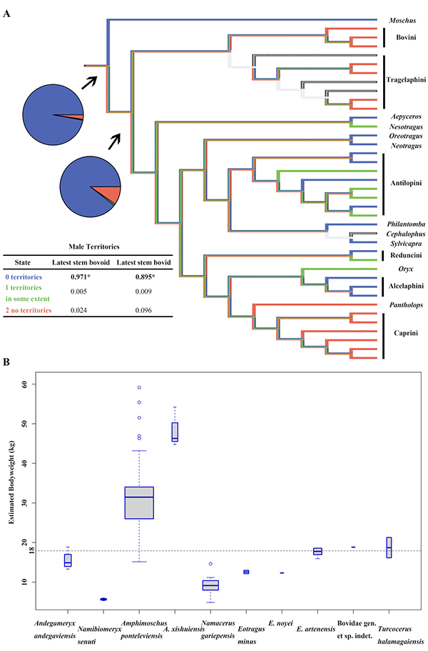 为了推断早期反刍动物的领地性行为,研究人员收集了现生牛科和麝科动物的行为学特征,包括一直生活于领地之中、在发情期或者特别的情形下展示出暂时的领地性和无领地性等。依据最大似然法对现生反刍类基因组推断出的系统发育关系进行祖先特征重建,得出最晚基干类群的牛科和牛总科成员统计学上显著地展示出具有领地性,一直生活于领地之中。