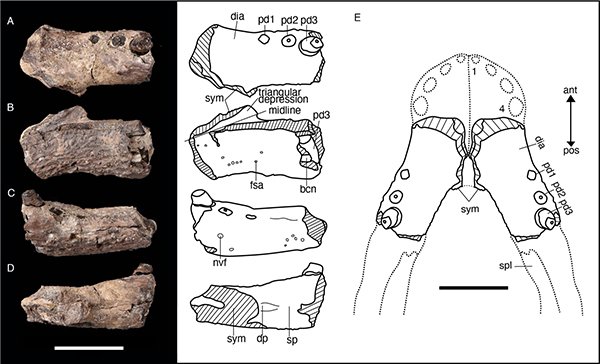 龙山延吉鳄Yanjisuchus longshanensis gen. et sp. nov.正型标本齿骨照片及线条图(Rummy et al., 2021)