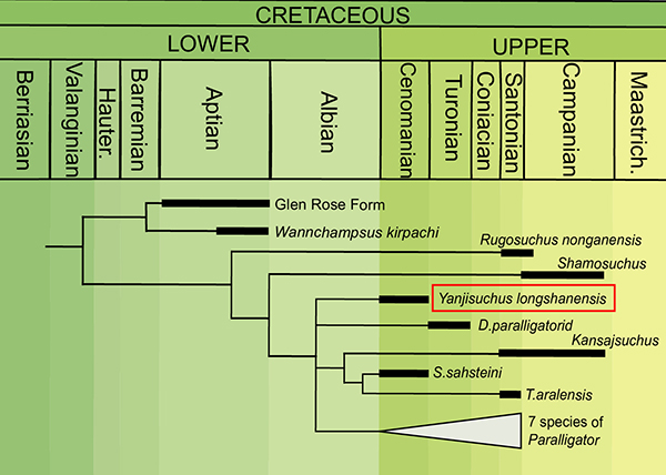 近日,国际学术期刊 《白垩纪研究》(Cretaceous Research)杂志在线发表了由中国科学院古脊椎动物与古人类研究所徐星-金昌柱延吉项目组的最新研究成果。在这篇题目为 “A new paralligatorid (Crocodyliformes, Neosuchia) from the mid-Cretaceous of Jilin Province, northeastern China” 的论文中,古脊椎所博士保罗·拉米和来自中、美、日等多国学者联合报导了大约1.01亿年前的吉林延吉龙井组中发现的一化石新鳄类(neosuchian),并命名为新属新种的龙山延吉鳄(Yanjisuchus longshanensis gen. et sp. nov.)。
