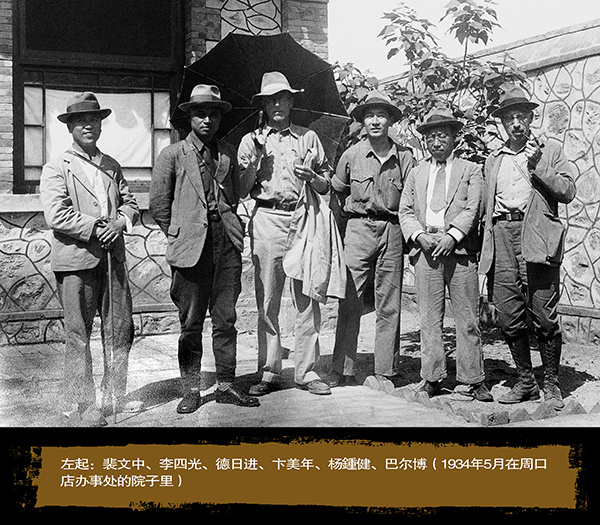 图3. 裴文中、李四光、德日进、卞美年、杨钟健、巴尔博(从左往右)在办事处合影留念。1934年贾兰坡摄