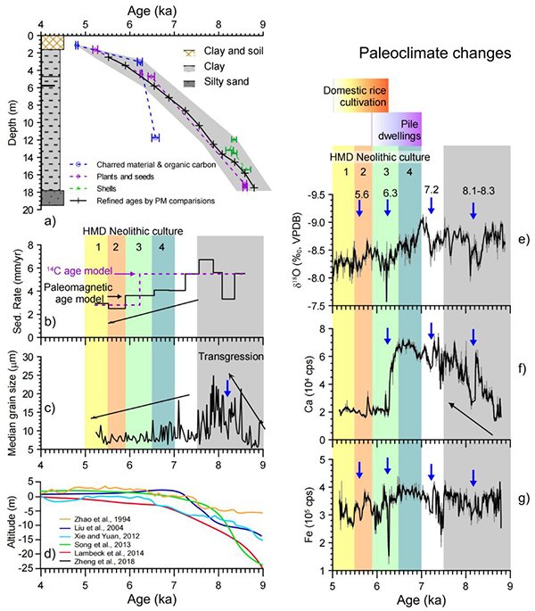 研究表明,古地磁场长期变和古强度变化的区域对比可以为全新世沉积物提供高分辨率年代标尺,减小14C年龄误差。在可靠的、高分辨率年代序列下,河姆渡地区经历多次气候变化,其中7500年前和6300年前两次重大的环境改变,影响并促进古人类活动的发展。