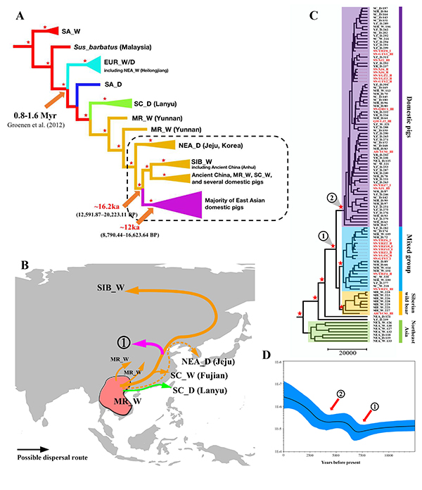 图2:A. 简化的系统进化关系树;B. 推测的野猪在东亚的扩散途径;C. 依据东亚家猪和野猪构建的系统进化关系树;D. 贝叶斯种群扩增曲线图