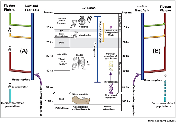 甘肃白石崖洞穴古人类化石与线粒体DNA的发现表明丹尼索瓦人这一最先发现于西伯利亚阿尔泰地区的古老人群曾经在青藏高原东北缘较为频繁的活动。由于缺乏考古遗存证明其永久性的在这一区域活动,且没有足够的遗传学证据表明高原的丹尼索瓦人是否携带(高频的)适应低氧环境的相关基因,因此,他们当时是否适应了高原低氧环境尚为未知之数。而早期现代人在高海拔环境活动的考古学证据主要来自三个阶段,分别为MIS 3晚期、末次冰消期和全新世气候最适宜期及以后。目前的考古学和遗传学研究成果对于早期现代人在高原的扩散和演化指向两种模型假说:连续生存活动与逐渐适应,其开端可早至MIS 3晚期;断续的生存活动,即古代人群在高原上多次短时间生存然后消失,直至全新世才实现永久性定居。