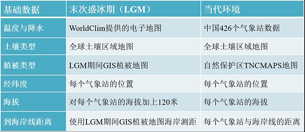 图1:末次盛冰期和当代气候条件下的数据输入类型与来源。