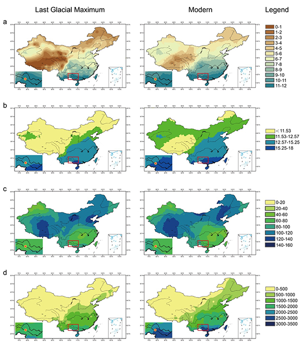 图2:本研究采用的生态模拟指标。a:生长季节长度(月);b:有效温度(°C);c:月降水量变异系数;d:净地表生产力(g/m2/year)。左列四张图显示末次盛冰期(LGM)阶段的模拟结果,右列四张图显示当代环境(大致相当于暖期阶段)下的模拟结果,左下角放大图中的红点指示广西百色盆地位置。