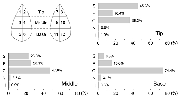 图3:百色盆地大型工具不同部位(尖部、中部、底部)加工程度统计。S=次级加工;P=初级加工;C=石皮;N=未经加工的工具腹面(以石片为毛坯);I=难以确定者。