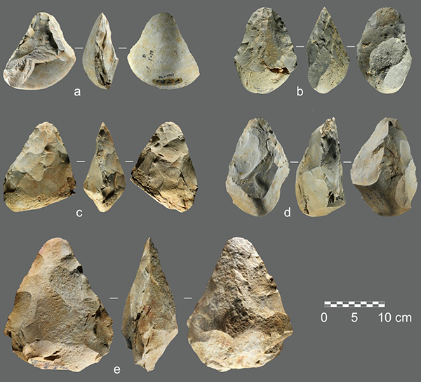 图4:百色盆地发现的部分手斧标本。a-d以砾石为毛坯,e以大石片为毛坯;a为单面加工,b-e为两面加工。