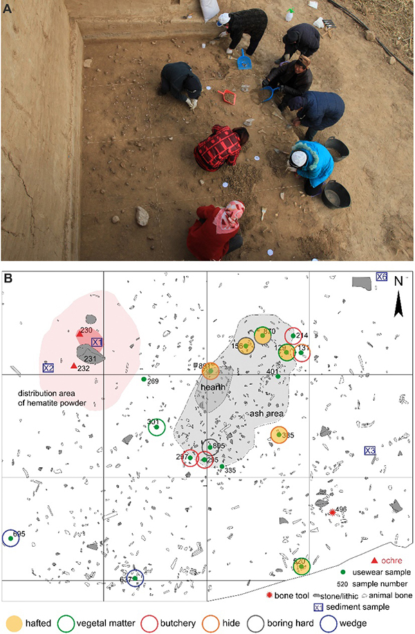 图5. 遗址位置、周边景观及地层. A,遗址野外发掘照;B.遗迹、遗物平面分布情况(含石器功能信息)(研究团队提供)
