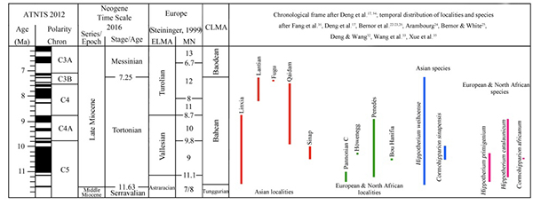 渭河和贾氏两个种之前被归入Hippotherium亚属,而通过近几年来对该分类单元逐渐清晰的认识,这一单元可提升为属。另一方面,渭河和贾氏种在大部分化石点共生,通过对新老材料的全面对比,证实这两个种之前被认为是明显差异的特征系种内变异和保存状况所致,二者应合并为一个种,即渭河古三趾马Hippotherium weihoense。根据临夏盆地的古地磁研究,首次出现渭河古三趾马分布记录地层的年代为11.5 Ma。维也纳盆地的Cormohipparion sp.应归为H. primigenium,年代被估计为11.4-11 Ma。因此渭河古三趾马是旧大陆最早的三趾马,三趾马事件应更名为古三趾马事件(图2)。
