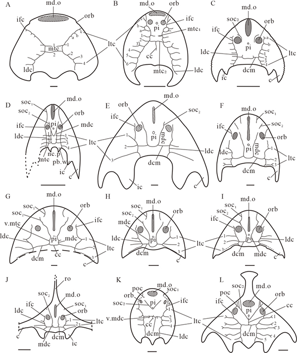 图4. 盔甲鱼亚纲各类群的感觉管系统