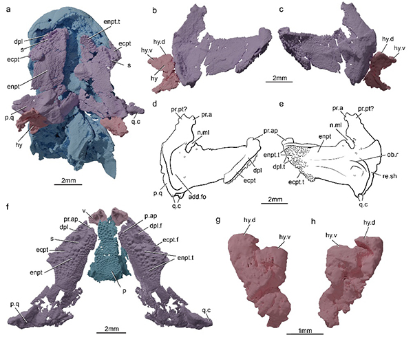 泥盆纪早期(约4.1亿年前)的希望奇异鱼被认为是最原始的肺鱼,它已经具有了典型的肺鱼食壳性特征,例如发达的齿板与短而粗壮的下颌。杨氏鱼的系统发育位置处在孔鳞鱼类(肺鱼形类的另一重要分支)和奇异鱼之间,较奇异鱼更为原始。因此,杨氏鱼是研究肺鱼类食壳性起源的关键。本工作研究的两件杨氏鱼标本幸运地保存了舌弓、鳃弓及腭部结构(图2)。化石材料显示,杨氏鱼腭方骨后部区域的内收肌窝深且宽阔,为内收肌提供了一个很大的空间,且腭方骨后缘近垂直,因此,杨氏鱼应该拥有强大的咬合力;其舌颌骨短而粗壮,与肺鱼类似;内翼骨上牙齿的形态与排列方式已经与奇异鱼和其他原始肺鱼非常相似,但杨氏鱼依然保留着具有大牙的外翼骨和膜质腭骨,只是牙齿非常粗壮且钝圆。综合这些解剖学结构,研究人员还原了杨氏鱼的进食方式:主要使用粗钝的大牙碾碎猎物,而齿板上那些较小的牙齿则起到辅助固定作用。