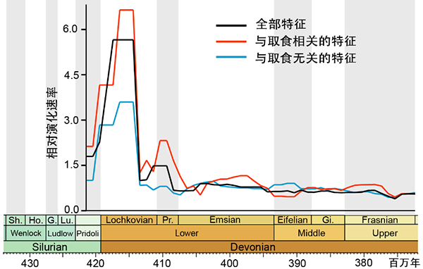 肺鱼类从一出现便显示出高度的特异性,并且多样性非常高,被认为在演化阶段初期经历了快速演化。本项工作采用贝叶斯末端定年法定量地分析了古生代肺鱼类的系统发育关系、分化时间及特征的演化速率,分析结果支持了以上假说(图4)。肺鱼类在志留纪晚期至早泥盆世洛赫考夫期末之间一个约7百万年的窗口期起源并经历了快速演化,尤其是与取食相关的特征明显比其他特征具有更高的演化速率。