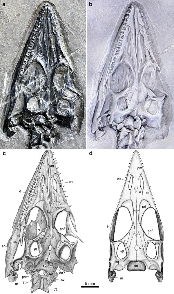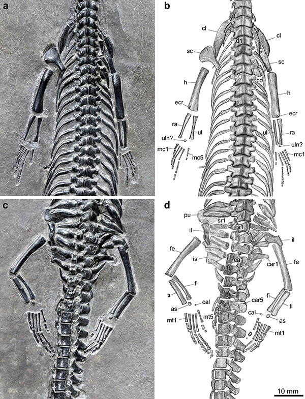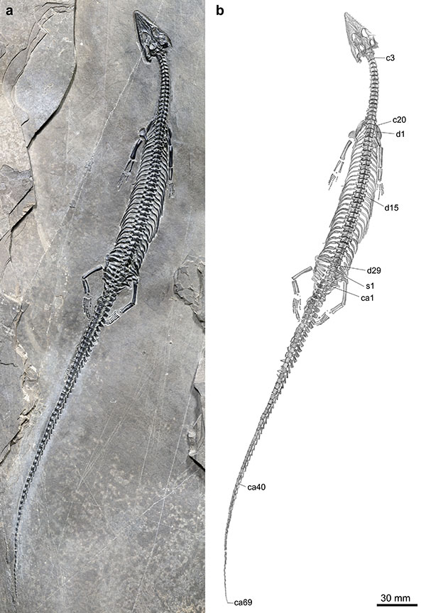 近日,以中国科学院古脊椎动物与古人类研究所徐光辉研究员为主导的研究团队在国际学术期刊《科学报告》(Scientific Reports)上报道了距今约2.44亿年前一个海生爬行动物新属种,长尾红河龙。它发现于我国云南省红河州泸西县中三叠世早期海相地层,全长47厘米,体形像水生蜥蜴,超长的尾巴尤其特别。长尾红河龙是我国肿肋龙科最早的确切证据,代表了世界上尾巴相对最长(由69块脊椎骨组成)、脊椎骨总数最多(121块)的肿肋龙类。