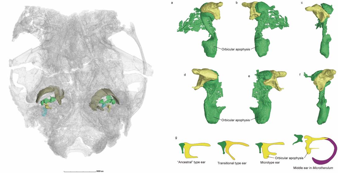 哺乳动物中耳是渐进演化的经典案例。现生哺乳动物的中耳具有三块听小骨(锤骨、砧骨、镫骨),而爬行动物中仅有一块耳柱骨。十九世纪欧洲生物学家已经观察到了现生哺乳动物中耳听小骨的多样性(图1)。同时,胚胎生物学家通过追索哺乳动物的胚胎发育过程,发现了听小骨源于形成第一鳃弓的胚胎组织,并通过系统比较四足动物头骨发育的差别,构建了有关哺乳动物中耳听小骨同源性假说的基本框架:锤骨与爬行类的关节骨和前关节骨同源,砧骨与爬行类头骨上的方骨同源,镫骨与耳柱骨同源。二十世纪初,一系列保存完好的下孔类化石的发现进一步支持了这一假说。在过去很长时间里,由于化石保存问题,哺乳动物中耳早期演化的讨论一直缺乏直接的化石证据。研究表明哺乳动物中耳听小骨经历了下颌中耳和过渡型中耳两个演化阶段,最终完全脱离下颌进入中耳腔。这一演化事件在中生代哺乳动物不同支系中多次发生。最有代表性的是二十世纪70年代对摩根齿兽头骨的系统研究,明确了下颌中耳这一演化阶段,以及过去二十多年,以燕辽、热河生物群化石为代表的中生代原始类群中所保存的过渡型中耳。然而,这些发现集中于基干类群,主要包括柱齿兽类、异兽类、真三尖齿兽类和对齿兽类,而在与我们人类演化密切相关的兽类(包括真兽类和后兽类)祖先中,中耳演化的直接证据十分有限。