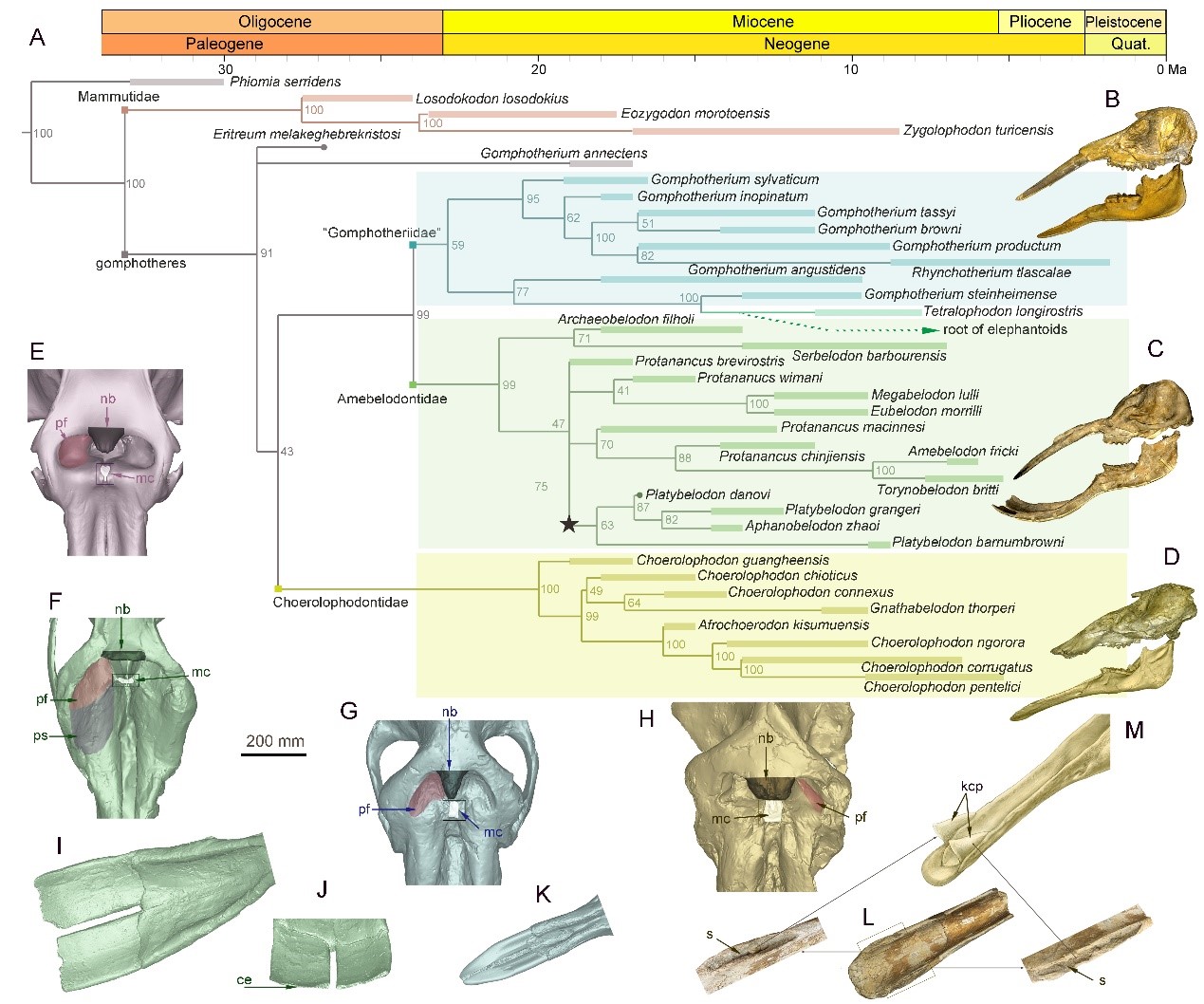 图1. 豕棱齿象科、铲齿象科和嵌齿象科在系统发育中的位置,以及三种象类下颌和鼻区的形态特征对比(李春晓 供图)