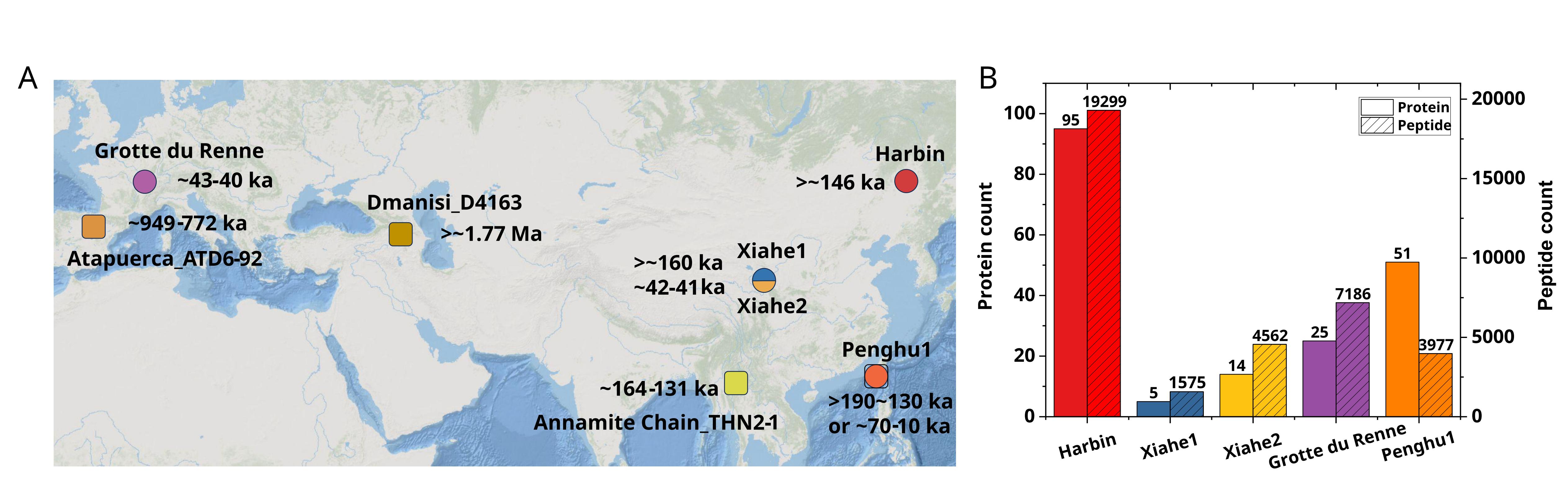 图1更新世古人类个体的地理分布及其蛋白质组特征(仅包含已报道的古蛋白质组相关研究)。