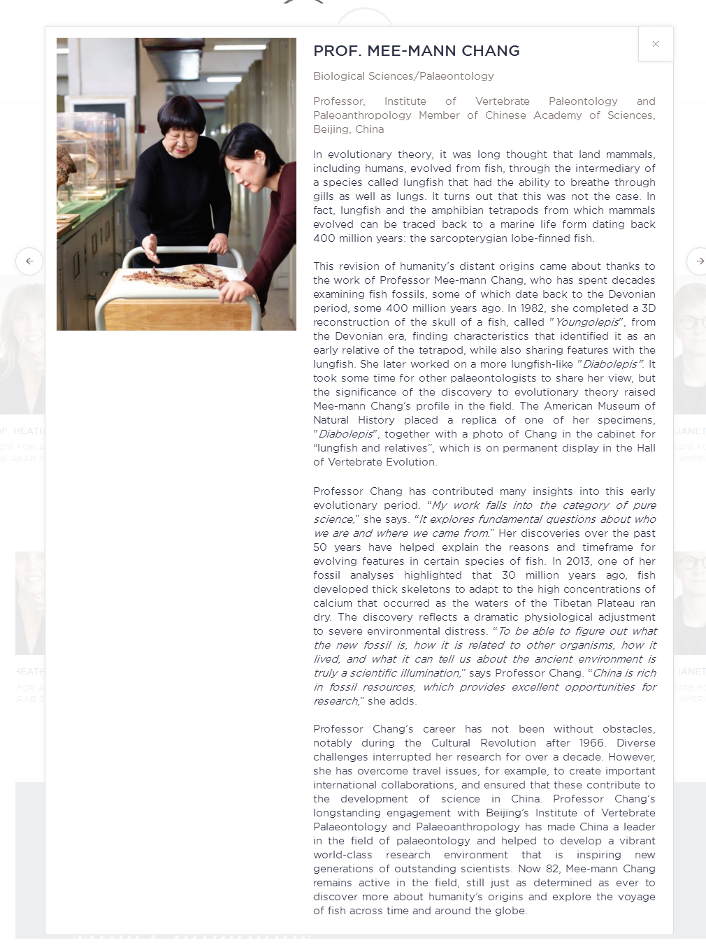 北京时间2018年3月23日凌晨,世界杰出女科学家颁奖典礼在法国巴黎举行。我国古生物学家张弥曼院士与来自南非、英国、阿根廷、加拿大的其他4位优秀女科学家共同获此殊荣,接收颁奖,她的颁奖词是“她在化石记录方面的开创性工作开启了对水生脊椎动物如何适应陆地生活的新见解”。张弥曼院士此行还参加了学术报告会议、庆祝“妇女参与科学项目”20周年等系列活动。