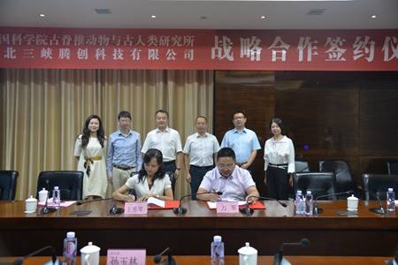 2019年08月29日,中国科学院古脊椎动物与古人类研究所与湖北三峡腾创科技有限公司战略合作签约仪式在湖北宜昌举行。古脊椎所王秀琴副所长、古动物馆王原馆长、宜昌市夷陵区孙玉林副区长、三峡腾创科技有限公司万军总经理和孟凡霞副总经理等领导和专家出席参加了签约交流会。