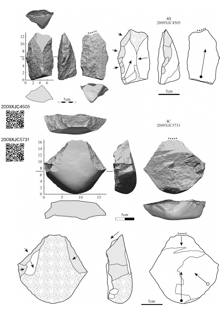 图2.徐家城遗址部分石制品技术分析图(扫描二维码可查看石制品动态三维模型)