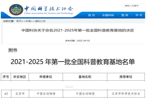近日,中国科协发布《关于命名2021—2025年第一批全国科普教育基地的决定》,中国古动物馆由北京市科学技术协会推荐,经初审、专家评审、终审等评审和调研环节,成功入选,获全国科普教育基地称号。中国古动物馆从2012年起连续多年入选全国科普教育基地。