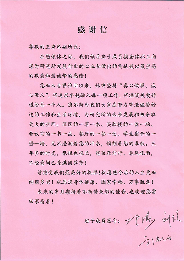 王秀琴表示,想到要离开古脊椎所这个“大家庭”,有诸多的不舍。很荣幸来到古脊椎所,在精诚合作的氛围下与所班子成员共事、谋事、干事,竭诚为广大职工服务。借此机会对大家的支持表示诚挚的谢意,祝愿研究所发展的越来越好。