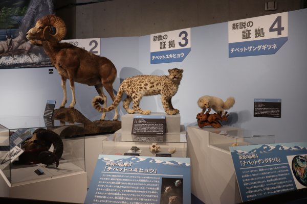 展区场景:在科学顾问指导下制作的发现于西藏的众多冰期哺乳动物祖先。盘羊的祖先—喜马拉雅原羊(Protovis himalayensis)(左上)、雪豹的祖先——布氏豹(Panthera blytheae)(上中)和北极狐的祖先——邱氏狐(Vulpes qiuzhudingi)(上右)