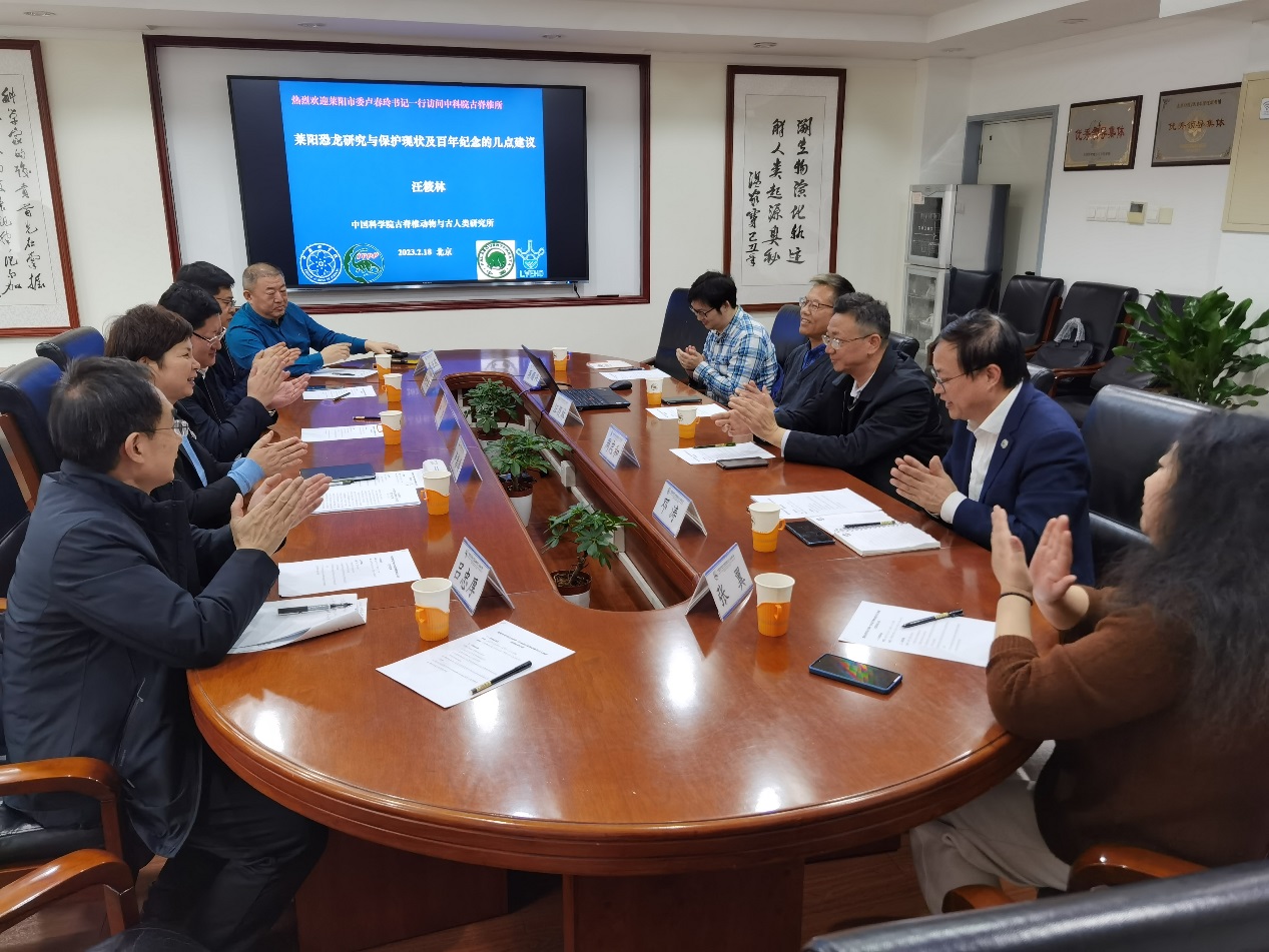 2月18日,莱阳市委书记卢春玲、市委常委宣传部长于涛等一行来访古脊椎所,与古脊椎所周忠和院士、党委书记、所长邓涛、汪筱林研究员、科技处处长张翼、蒋顺兴副研究员一起,就进一步加强合作及筹备莱阳恐龙发现百年纪念活动进行商讨。
