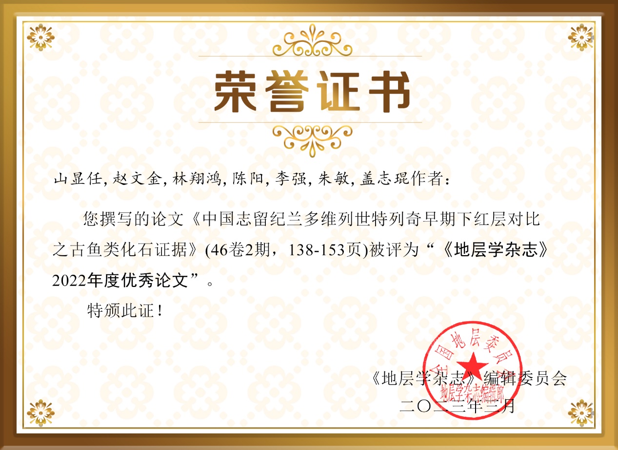 最近,《地层学杂志》公布2022年度优秀论文评选结果。基于论文的学术影响力及学术价值,经主编、副主编推荐及无记名投票评选出3篇年度优秀论文。以古脊椎所硕士研究生山显任为第一作者,盖志琨研究员为通讯作者的封面论文“中国志留纪兰多维列世特列奇早期下红层对比之古鱼类化石证据”入选。