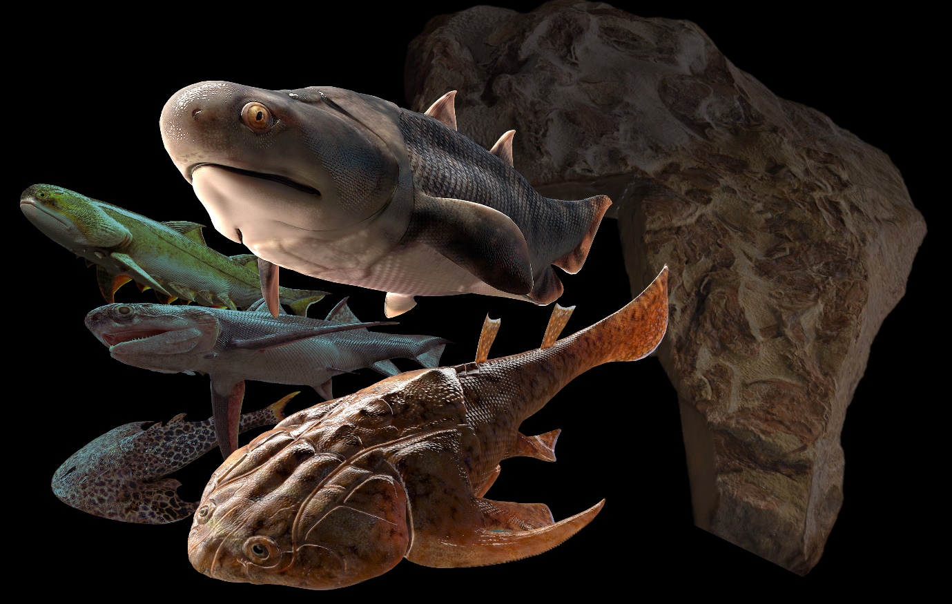 图注: 左,志留纪早期重庆生物群特异埋藏化石库和贵州石阡化石库中的鱼类生活复原,从上到下分别为:蠕纹沈氏棘鱼、新塑梵净山鱼、双列黔齿鱼、灵动土家鱼和 奇迹秀山鱼,右,奇迹秀山鱼和蠕纹沈氏棘鱼正型标本所在石板的三维虚拟渲染。制图:拟石科技。