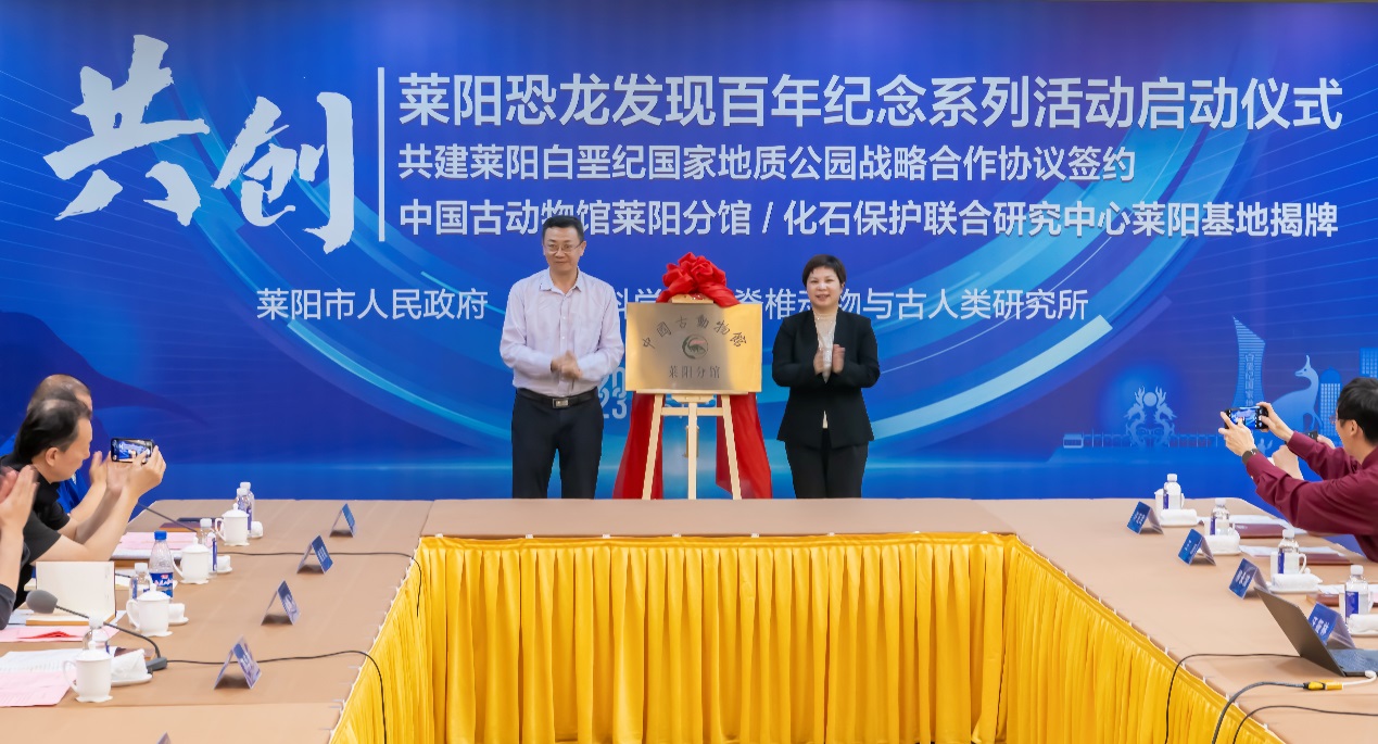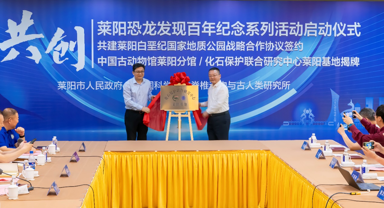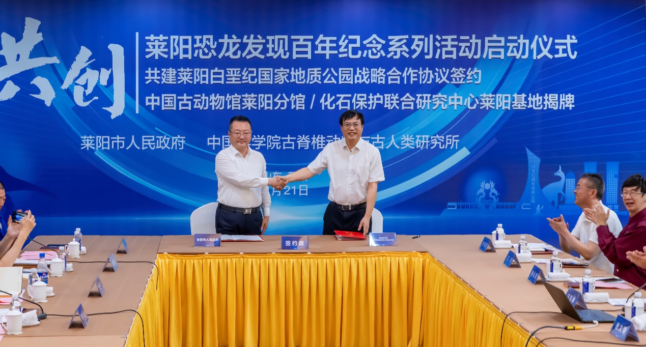 5月21日,古脊椎所与莱阳市委市政府联合举办莱阳恐龙发现百年纪念系列活动启动仪式并签署战略合作协议,古脊椎所党委书记、所长邓涛、汪筱林研究员、科技处张翼处长、古动物馆王原馆长等出席仪式。周忠和院士、徐义刚院士带队的国家自然科学基金委基础科学中心项目专家团队在莱阳进行野外科考期间参加本次活动。