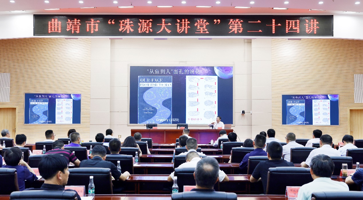 7月13日,在云南省曲靖市曲靖会堂新闻发布厅主会场举办的“珠源大讲堂”第二十四讲上,中国科学院院士朱敏研究员作为受邀嘉宾作了题为“曲靖古鱼王国,‘人之由来’文化高地”的主讲报告,同步现场直播。曲靖市市委和市级国家机关各部委办局,各企事业单位、人民团体,中央、省驻曲有关单位主要负责同志在主会场参加活动,各县(市、区)和各乡(镇、街道)设分会场,累计近1.5万名领导干部全程收听收看。
