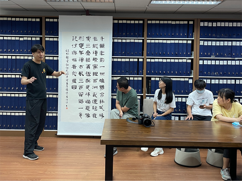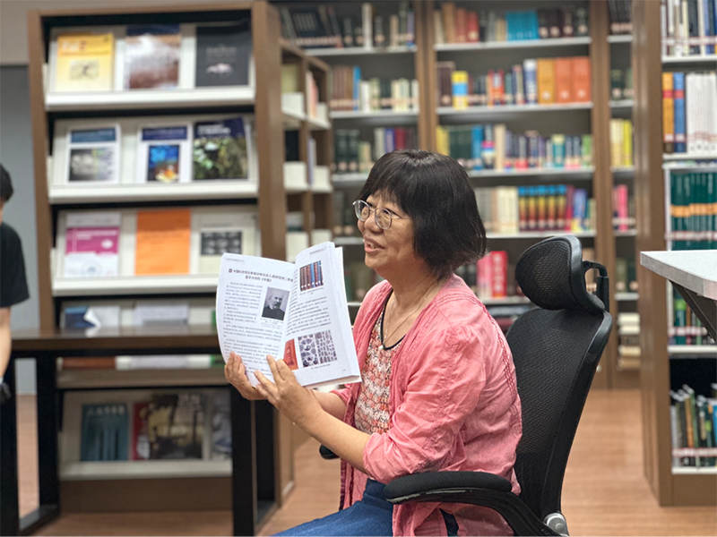 在所史馆内,葛旭引领大家重温了古脊椎所近百年的发展历程;陈竑生动地介绍了多件从我所档案馆馆藏文物中所挑选的重要文物;在座谈会上,曹颖介绍了我所图书馆收藏杨钟健、裴文中、周明镇三位院士藏赠书的院士藏书室,以及老一辈科学家重视收集图书资料,后辈学子传承有序的借阅记录的资料和故事;张立召作为影片《杨钟健》的科学指导及演员,谈了参与拍摄影片《杨钟健》的心得体会,分享了老一辈科学家不畏艰苦、积极乐观的探索精神;许勇介绍了杨钟健先生作为诗人所体现的家国情怀、科学精神的一面,并且朗诵和展示了自己的书法作品《杨钟健题许氏禄丰龙再造像诗一首》。