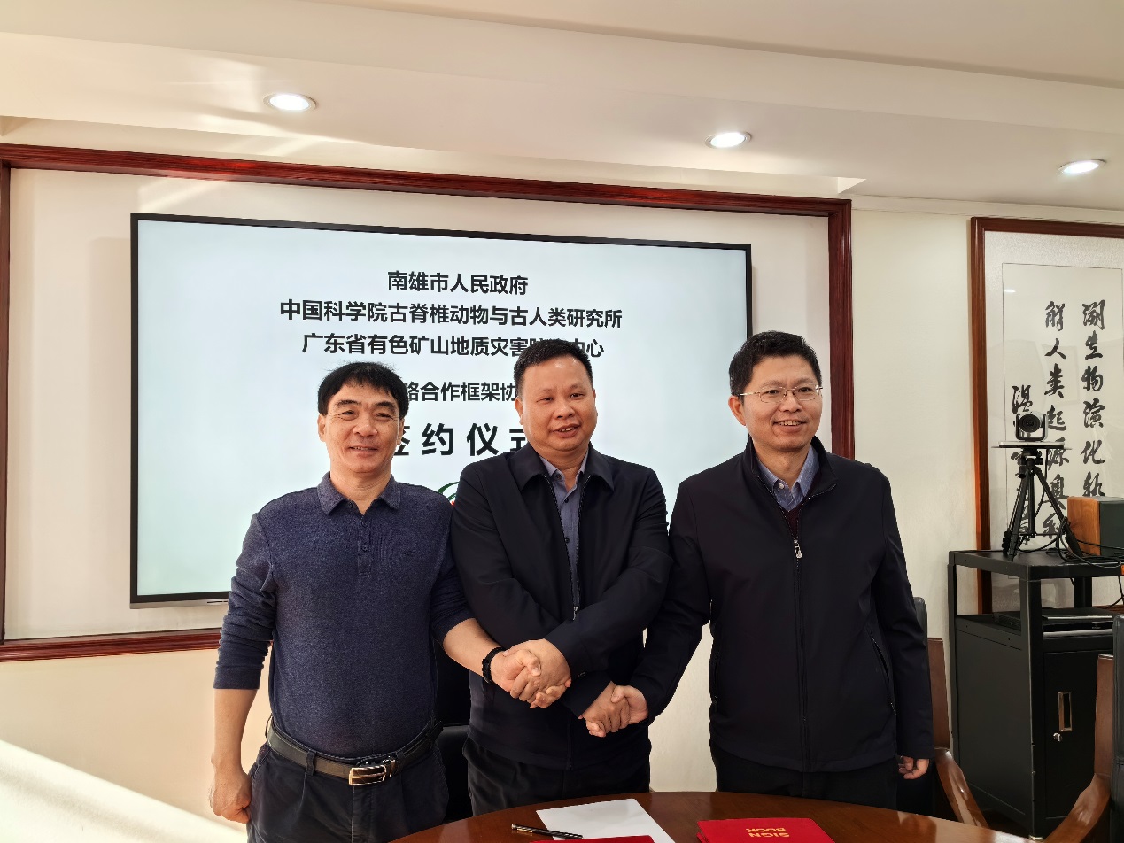 刘俊对赖副市长等一行来访表示欢迎。赵资奎和叶捷介绍了上世纪80年代以来在恐龙灭绝原因和早期哺乳动物兴起等领域取得的重大成果,并强调南雄地区具有进一步开展科研工作的巨大潜力。为进一步加强交流合作,为今后开展科研工作奠定基础,中国科学院古脊椎动物与古人类研究所与广东省南雄市人民政府和广东省有色矿山地质灾害防治中心签订了战略合作框架协议。