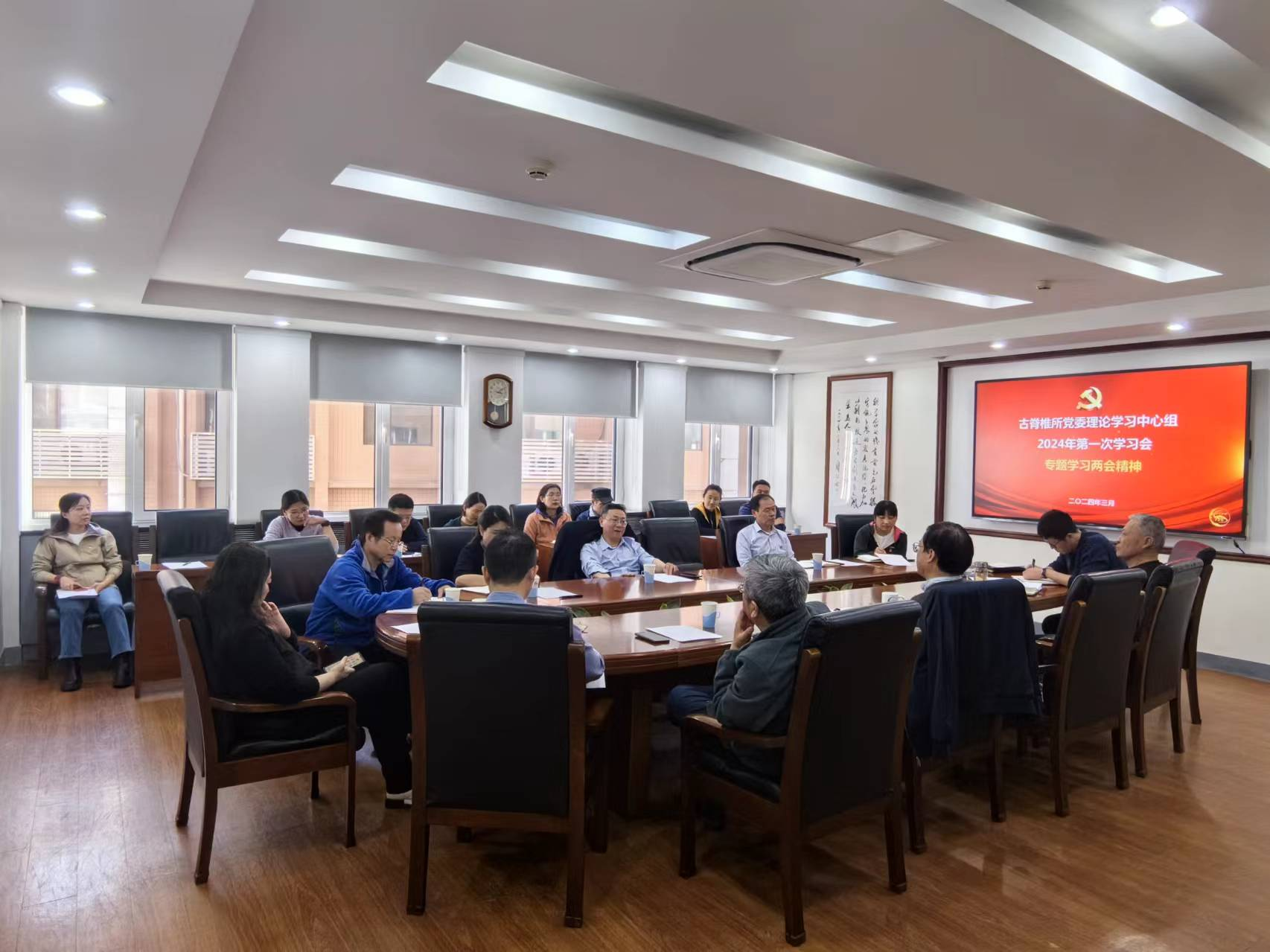 3月19日下午,古脊椎所召开党委理论学习中心组(扩大)学习会,专题学习全国两会精神。会议特邀全国政协常委周忠和院士介绍全国两会相关内容。所领导班子成员、党委委员、纪委委员、中层党员干部参加会议。党委书记、所长邓涛主持会议。