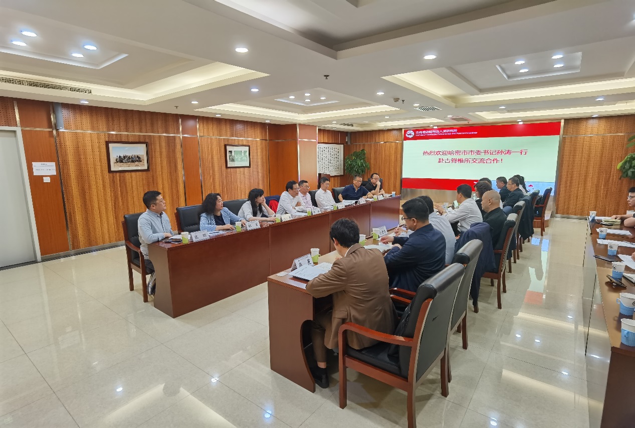 4月22日,哈密市市委书记孙涛一行携中国探险协会主席韩勃、华强方特文化科技集团股份有限公司副总裁云爱华等到访古脊椎所。研究所周忠和院士、党委书记、所长邓涛、副所长刘俊、汪筱林研究员、付巧妹研究员、科技处张翼处长等参加。