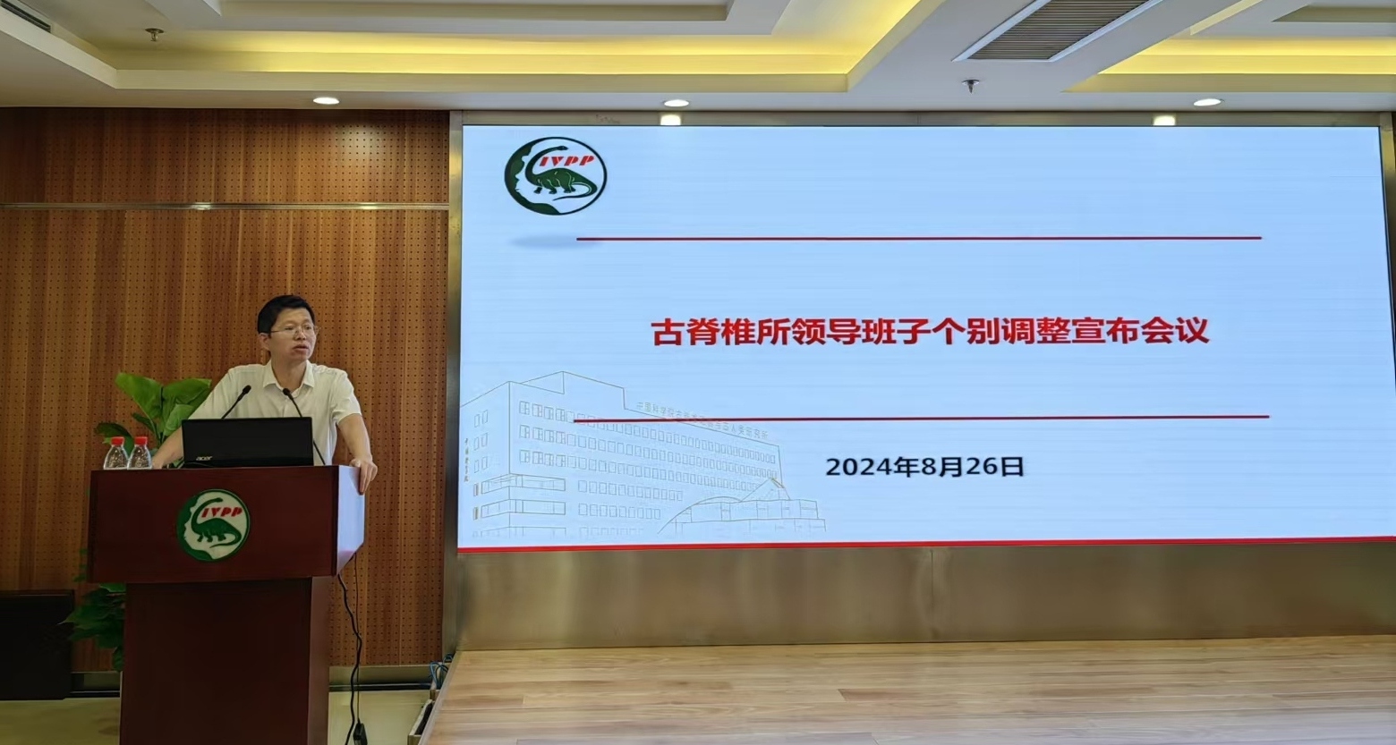 8月26日上午,古脊椎所召开领导班子个别调整宣布会议。中国科学院人事局副局长蔡宏志同志出席会议,领导干部二处副处长李熠熠同志,研究所领导班子成员、党委委员、纪委委员以及科研、支撑和管理骨干参加了会议。大会由党委书记、副所长刘俊同志主持。