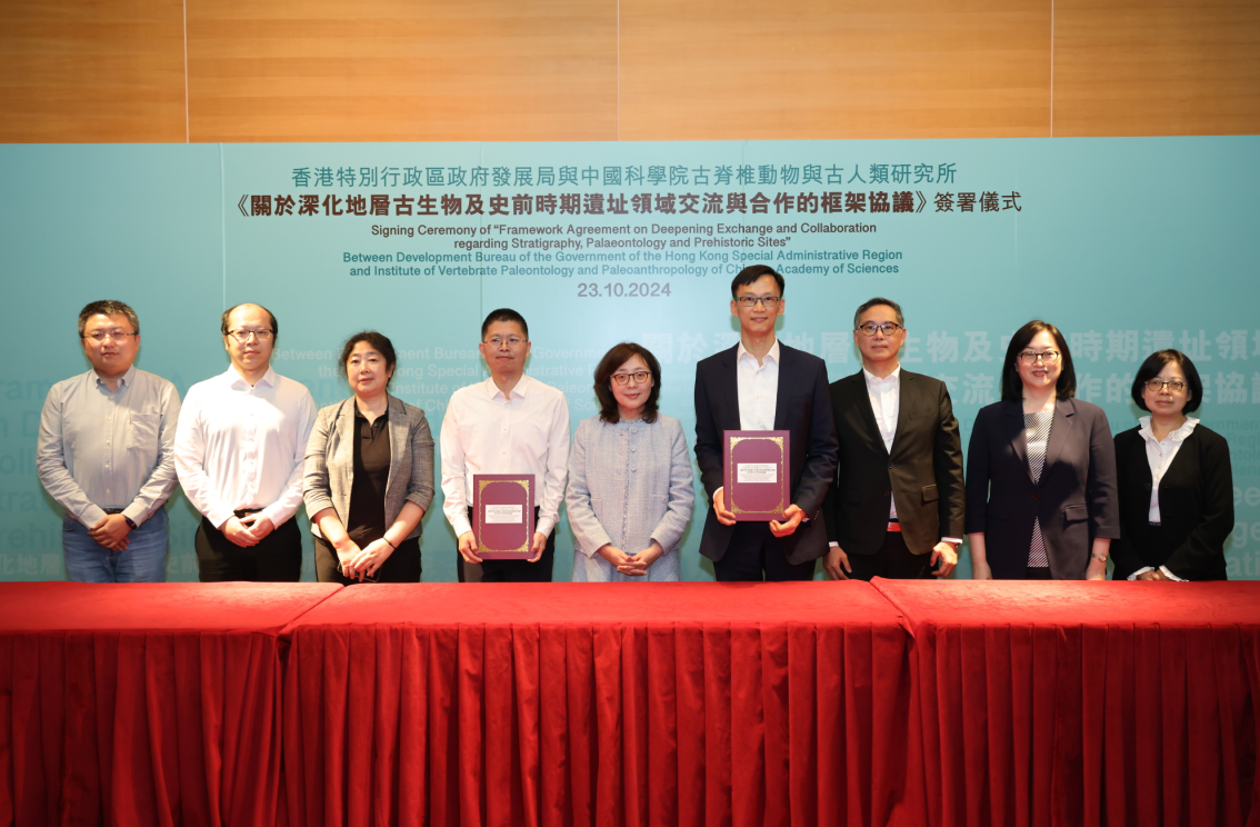 10月23日,中国科学院古脊椎动物与古人类研究所与香港特别行政区政府发展局签署了合作协议,推动双方在古脊椎动物学和古人类学领域的科学研究、人才培养、科学普及、展览交流等多方面的合作。古脊椎所党委书记、副所长刘俊,科技处处长张翼,副研究员裴睿和赵祺,香港特别行政区发展局局长甯汉豪,文物保育专员蒋志豪,文物古迹办公室主任萧丽娟等人出席了签约仪式。